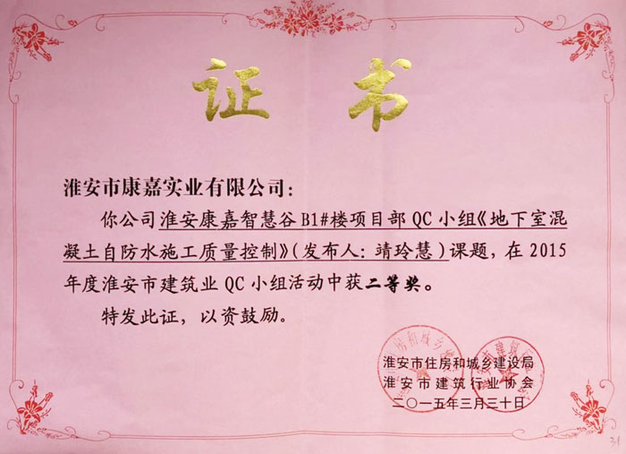 2015年淮安市建筑業(yè)QC小組活動二等獎