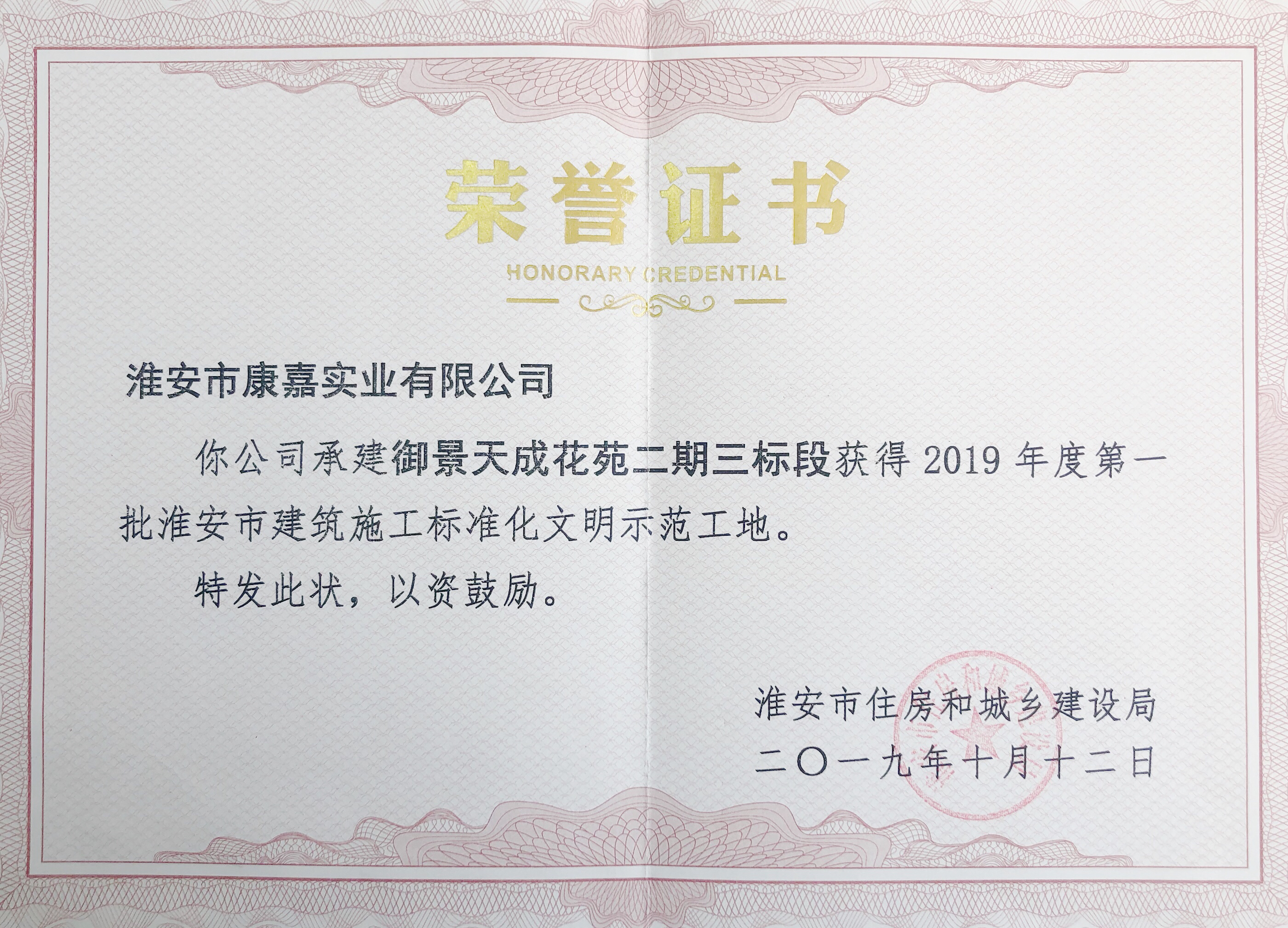 康嘉實業(yè) >> 首頁 >> 公司概況 >> 市級標化文明示范工地榮譽
